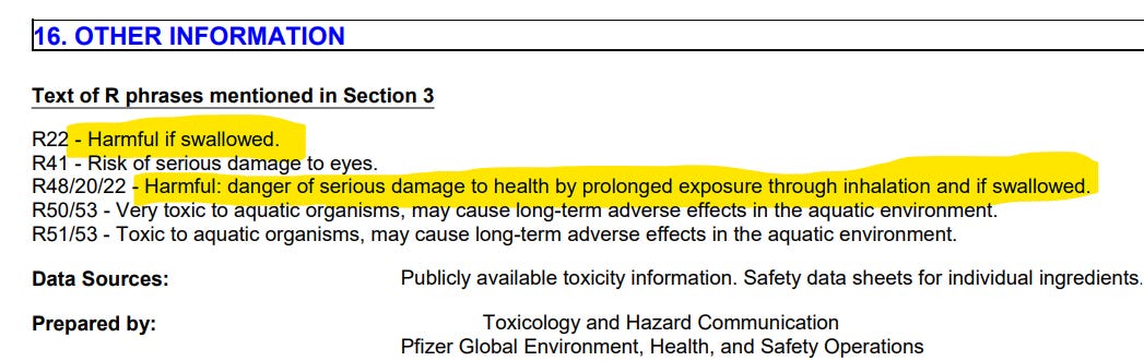 This safety data sheet is authored by Pfizer, so it is actual information that they legally must provide to the factories working with their chemical blend. The safety data sheet related to the ingredients of this product and the safety of such: