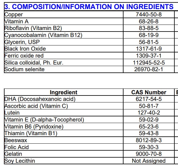 I have no desire to look up more ingredients, because even if they’re all super-duper healthy chemicals, I can’t get past the Vitamin containing at least four hazardous chemicals that attack the heart and blood (and B12 is a carcinogen). So instead of investing more time into looking up more ingredients, let’s look at the rest of Pfizer’s Safety Data regarding this Vitamin mixture: