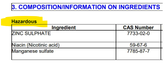 I pulled up the Manufacturers Safety Data Sheet for the first hazardous ingredient on the list, Zinc Sulphate.