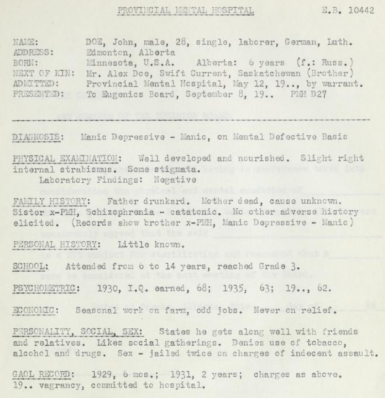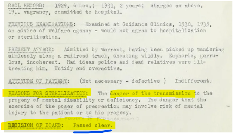 The hospital then submitted this data to The Eugenics Board, who used this data to determine that this man was a good candidate for sterilization, because of, “the danger of the transmission to the progeny of mental disability or deficiency". This case was then “cleared” by the Board, meaning he could be sterilized in the hospital.