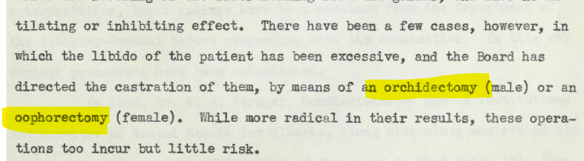 In Alberta, Canada, the power to decide who should be sterilized was ultimately given to The Senate of The University of Alberta and the Council of the College of Physicians. When this occurred, four total people from these two entities would decide the fate of each “case”. Eugenics organizations began popping up all over, such as, “The Committee of the American Neurological Association of Eugenical Sterilization” and, “The Human Betterment Foundation”. These organizations lobbied for Eugenics, wrote educational material, and helped construct more amendments to the laws. With non-doctors now running the show, new forms of Sterilization were added to the list, designed for “special cases”. One example of a special case is if the board determined the case had “excessive libido” (high sex drive). Those special cases would be subjected to Orchiectomy (the complete removal of both testicles) or Oophorectomy (removal of the ovaries).