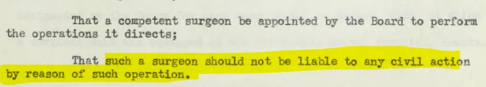 A few years later “psychotic” was added to the list followed by, “individuals who are not mentally defective”. Yes, you read that correctly. At this point, pretty much anyone could be a candidate for Sterilization and, the worst part was that the interpretation of each word was left to the doctor, so it was the doctors opinion of “insane”, “psychotic”, “feebleminded” or “pervert” that determined if an individual would lose their right to bear children. Fun Fact: “Syphilitics” means a person who has the STD Syphilis. During this same timeframe the government and universities were running secret, diabolical human experiments in which they were injecting people with Syphilis. They were primarily targeting prisoners and people who were institutionalized, but also infected prostitutes, who would then infect soldiers and men in general. So, you could unknowingly, and without consent, be part of a secret experiment that gave you Syphilis, which resulted in the government sterilizing you for having Syphilis. Oh, and I should mention, another amendment to the law was complete immunity for surgeons who performed the operation, regardless of the outcome. But don’t worry, according to the new amendment, only “competent surgeons” will be appointed to perform the surgery: