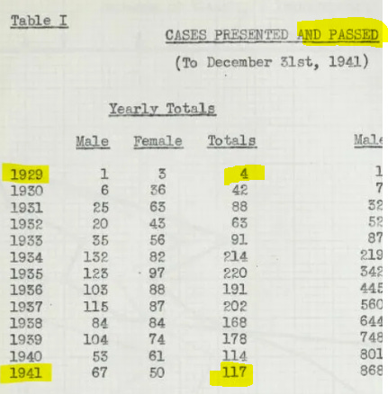 You can see just how much of an impact these amendments had on the quantity of sterilizations in the chart below. In 1929, when the rules were strict and patient consent was required, only 4 total people were Sterilized. As the Amendments poured in, every year the number would grow. By 1931 there were 88 sterilizations in a year. In 1935 the total hit 220: