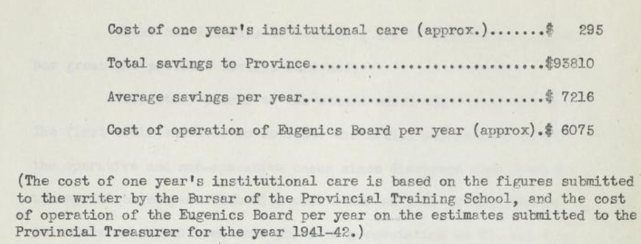 The Eugenics Board stated that in a single year these sterilizations potentially prevented "at least 318 children from being born”, which they claim resulted in almost $100,000 “total savings to Province” (which would be worth a little over $2 million in 2023).