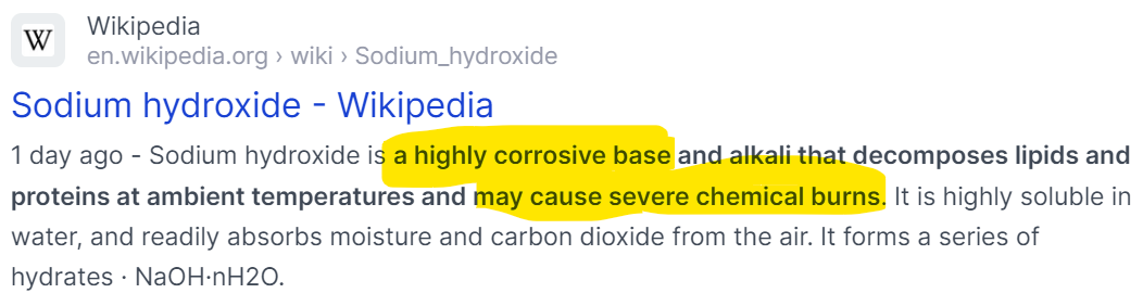Sodium Hydroxide is used to make paper, aluminum, commercial drain and oven cleaners, and soap, detergents and making pretzels. It absorbs moisture and is labeled a “highly corrosive base” that “may cause severe chemical burns” . You can check out the MSDS here.