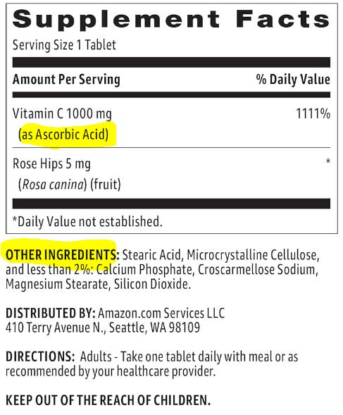 So, based on my research, if you need to take a chemical to supplement your Vitamin C levels, those are your six primary options. Now I am going to pour another whiskey and we are going to look at what is being sold on Amazon as Vitamin C and check out the ingredients: