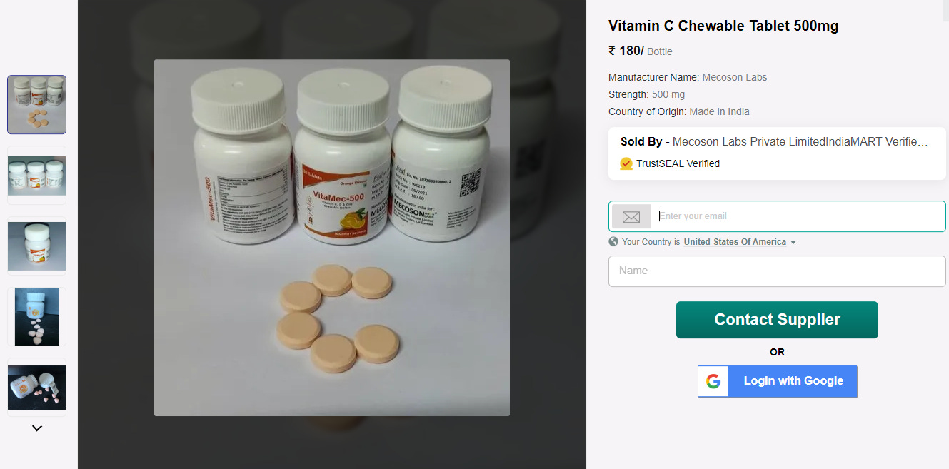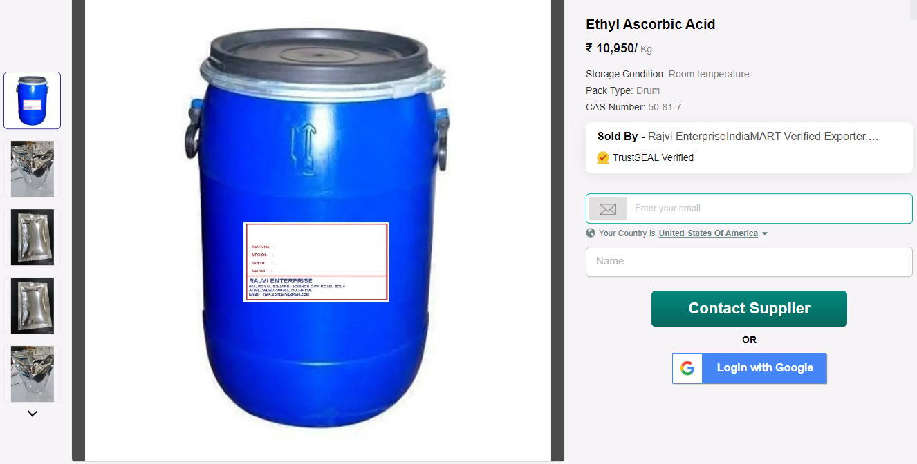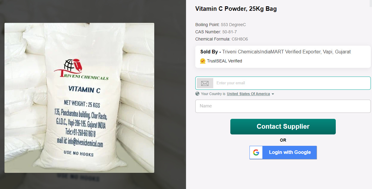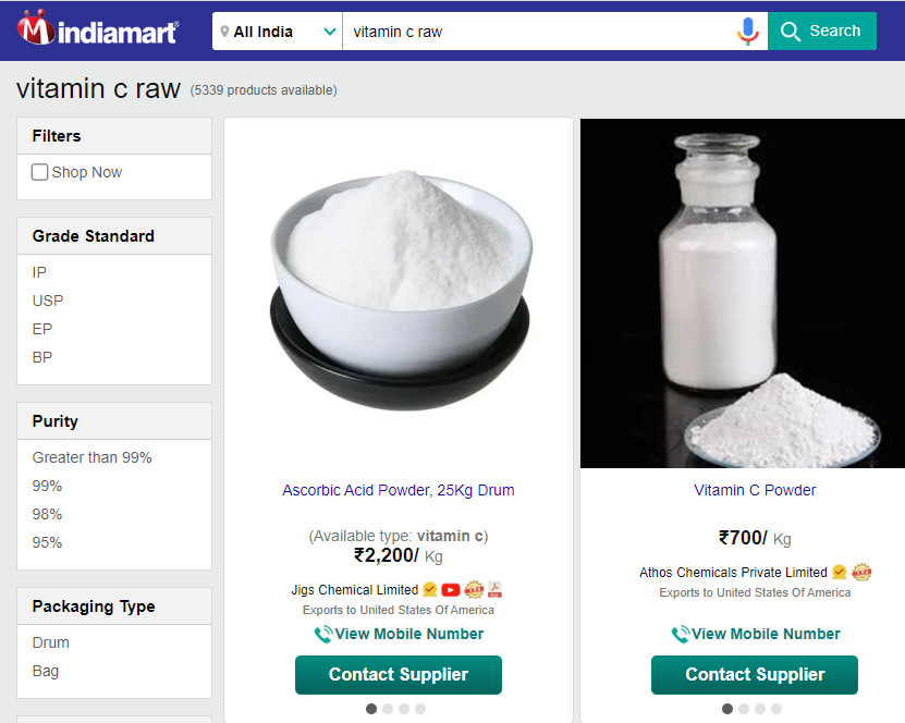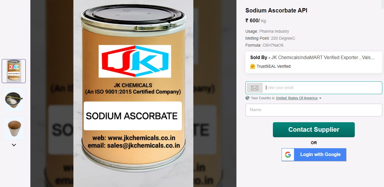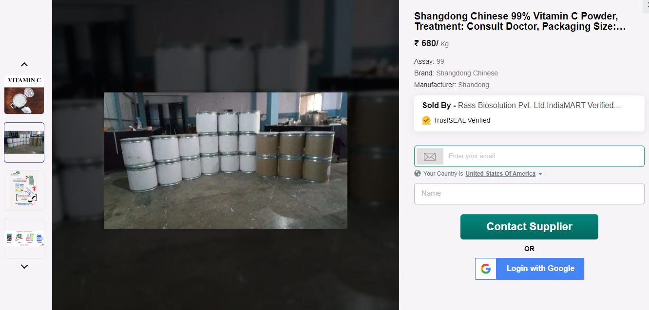If you read my Vitamin D3 is Rat Poison and Vitamin B12 is Cyanide Substack posts, you already know the vast majority of Vitamin chemicals come from India and China, so I head back to IndiaMart.com, in hopes of finding some ingredients. IndiaMart is like the eBay of Made-in-India chemicals, all of the factories list on there, so it makes looking at all different brands easy.
