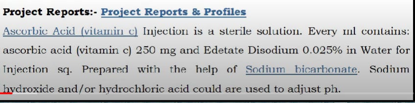 As you can see from the above screenshot, we now have some ingredients from the “fermentation process” to look at; Bacillus spp., Lsorbose and Ketogulonicigenium vulgare. I was also able to locate a second screenshot that shows additional ingredients, which are used in the Vitamin C injections. Let’s add these ingredients to our list to research: