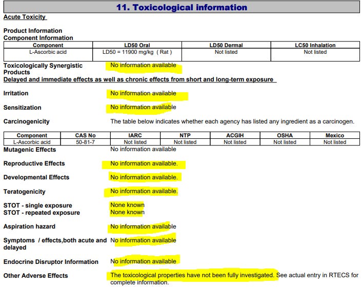 Also, according to the Ascorbic Acid chemical manufacturer, it should not be released into the environment, it should only be handled in well ventilated areas while wearing protective gear and lastly, we don’t know sh*t about how toxic it is to humans because it’s never been studied by the manufacturer, so all we know is how much of this Vitamin will kill a rat (I guess there really is such thing as “too much of a good thing”?)
