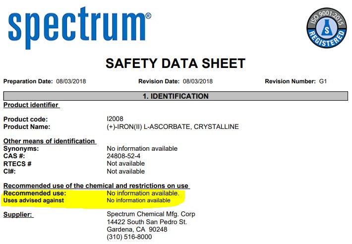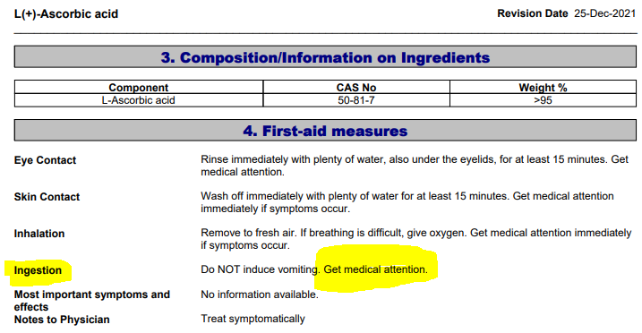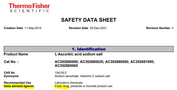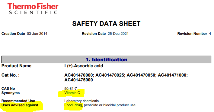When we pull up the Manufacturers Safety Data Sheet (“MSDS”) for Ascorbic Acid, we see that, just like Vitamin D3 and B12, Ascorbic Acid should not be used as food or drug, it should only be used as a laboratory chemical: