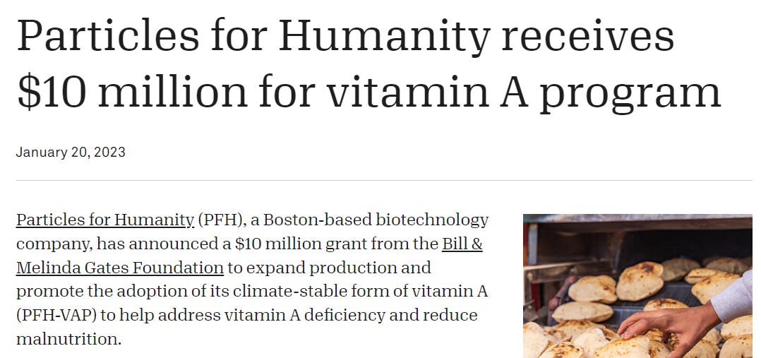 Do you know who else is super deep in the synthetic Vitamin industry? The Bill and Melinda Gates Foundation. Here’s a short timeline of some of the Gates Foundation’s dedication to getting synthetic Vitamins into all of us, for our wellbeing!