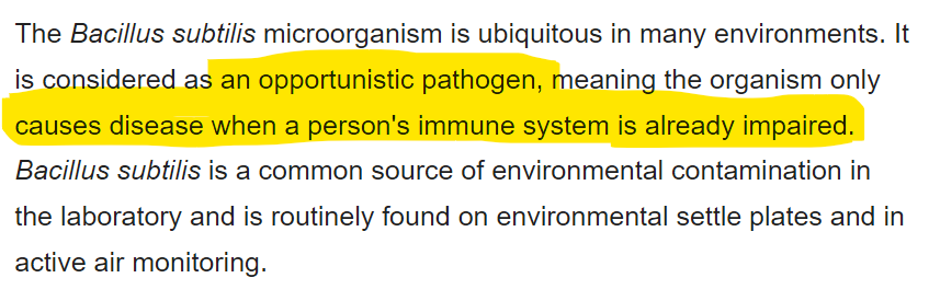 A different scientific paper confirms it is a pathogen which causes disease in people with impaired immune systems. This bacteria produces an extracellular toxin known as subtilisin, (which is commonly used in laundry detergent) but it is listed having “very low toxigenic properties”, so that’s good.