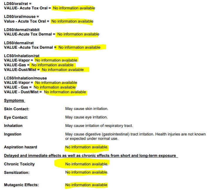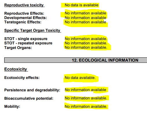 Also, no testing whatsoever has been performed, so no data is available, so they don’t know if it’s toxic. Here’s the MSDS for your review.