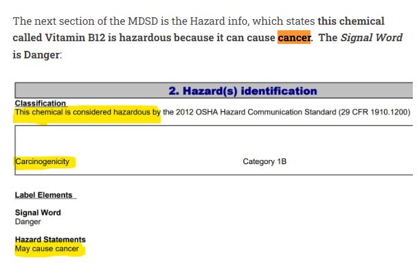 The first study (from the Jun 15, 2001 issue of Science) showed that “synthetic vitamin C may contribute to the formation of genotoxins that can lead to cancer”, which I found interesting because in my Substack post, Vitamin B12 is Cyanide, the MSDS for Vitamin B12 (chemical) says it too can cause cancer: