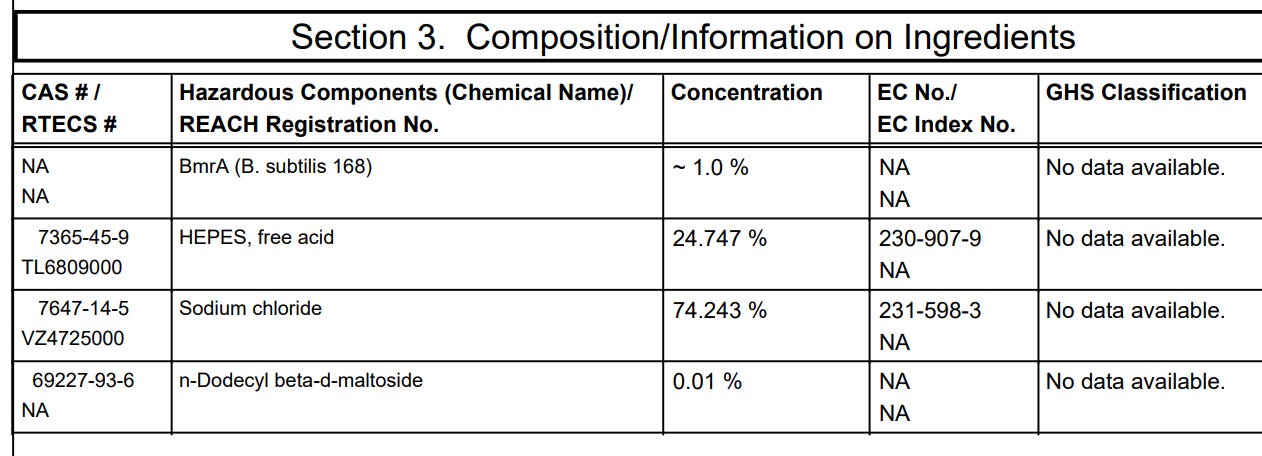 Here’s the MSDS for “B. Subtilis”, also known as Biotin, Vitamin H or Vitamin B7. Check out the the ingredients: