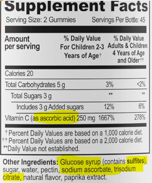 Contains Vitamin C as Ascorbic Acid, Vitamin D as Cholecalciferol (rat poison), B-12 as Cyanocobalamin (Cyanide), B6 which is likely made from formaldehyde, HCL acid, and petroleum ester in addition to Vitamin E, which is likely photography industry waste, plus 4g added sugar per dose, but the label says they’re made with natural raspberry and lemonade flavor, so that’s a plus!: