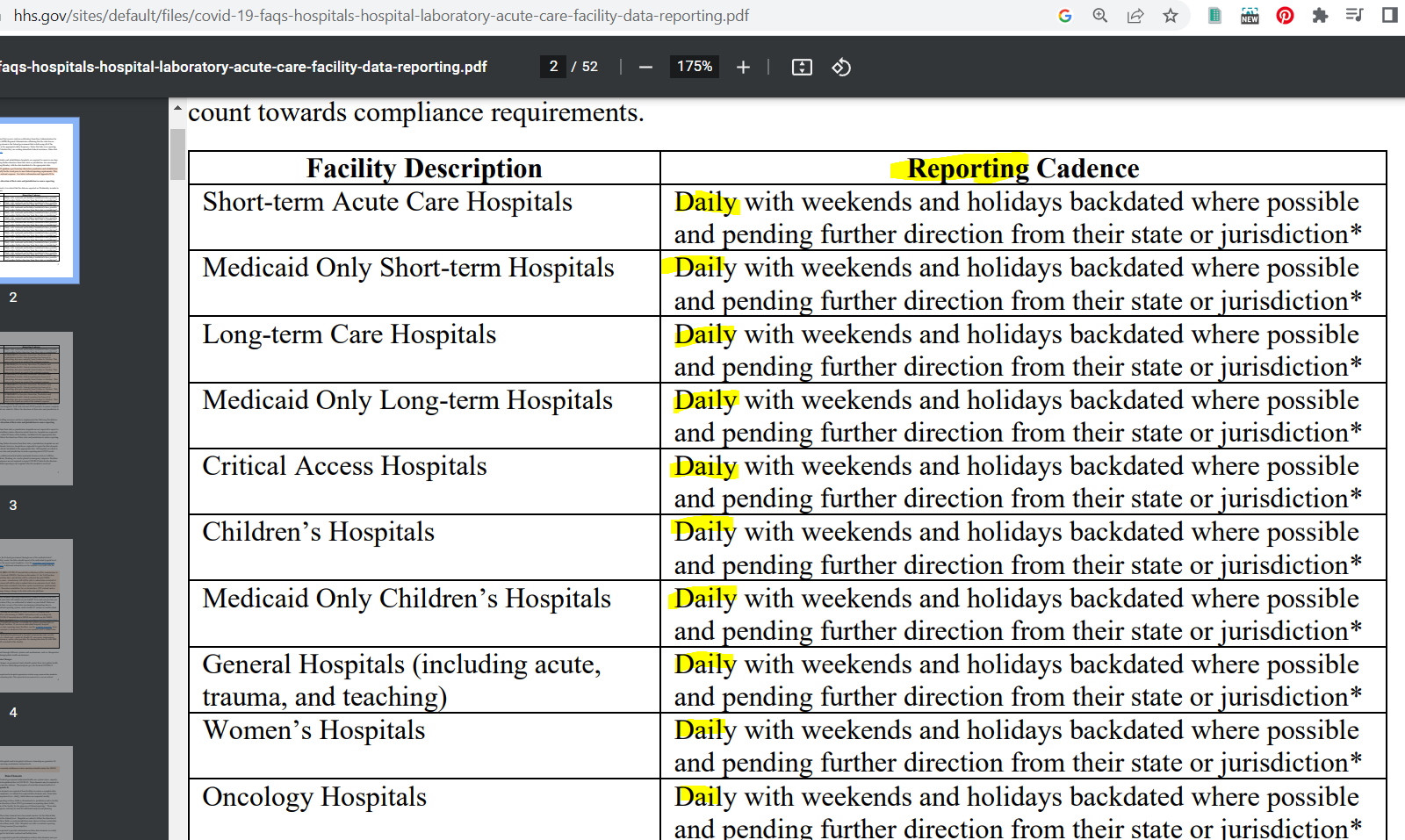 Every state I looked at was like this. I thought, perhaps states were only reporting one-to-two days per week, which would explain why the data is like this, but on HHS.gov I learned they were required to report daily in order to receive government payments: