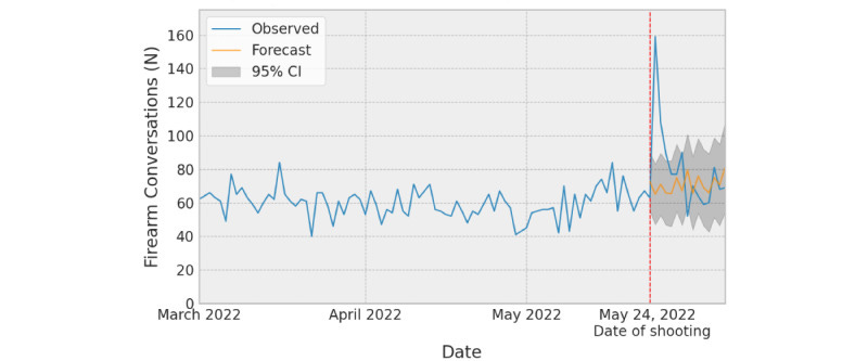 The Uvalde Experiment concluded “there was a significant increase in the number of conversations mentioning firearms following the shooting, with the largest spike occurring the day after the shooting (n=159) on May 25, 2022.” … “Within firearm conversations, grief issue tags showed a significant increase in proportion in the week following the shooting, while “isolation/loneliness,” “relationships,” and “suicide” issue tags showed a significant decrease in proportions the week following the shooting.”