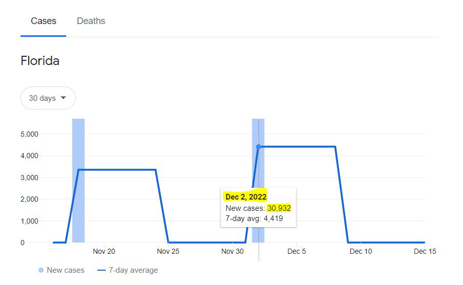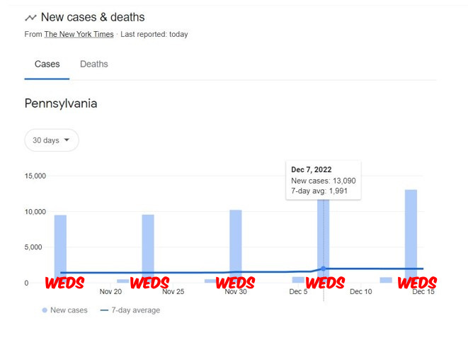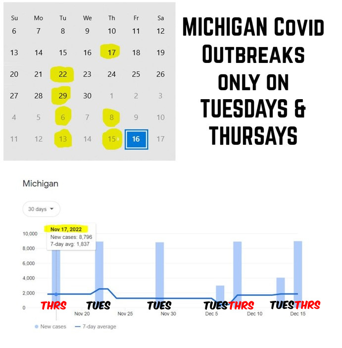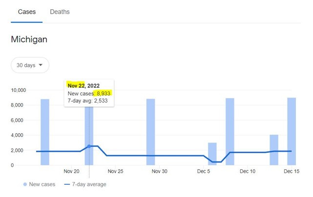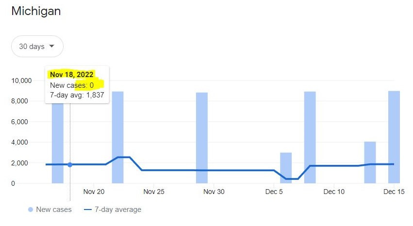 At the time, my only impression was that it was more propaganda; yet another way to scare people. I rolled my eyes and forgot about it. Several months later, my fellow Michigan researcher pointed out that if you zoom in, you can see a breakdown by day, and questioned why there were no cases, followed by spikes of cases, followed by no cases: