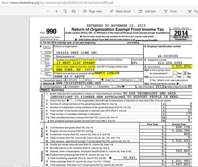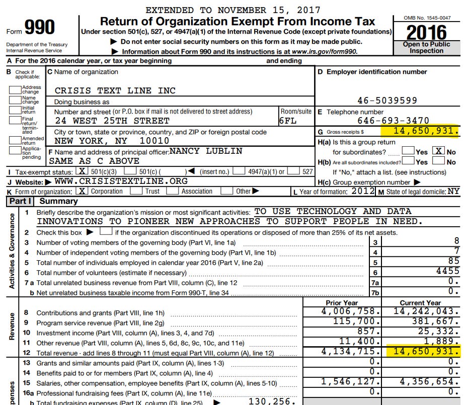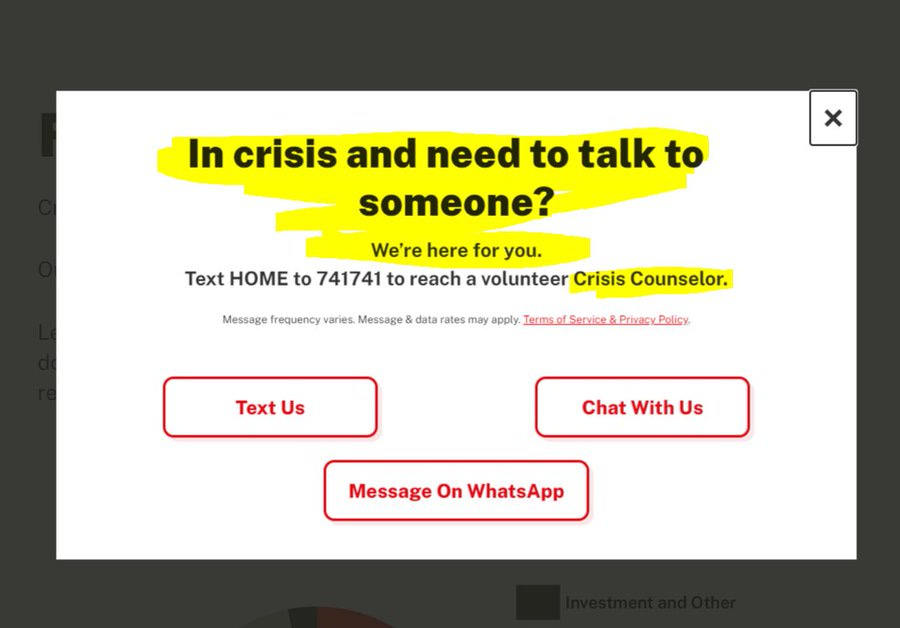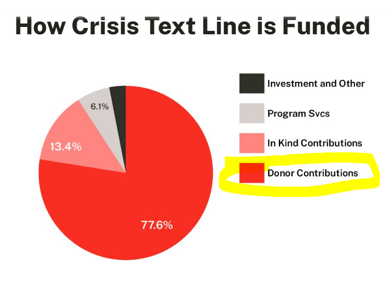 I located the website for the text number, CrisisTextLine.org and accessed their Financials page. Wanna know who is funding the Crisis Hotline? Donors, specifically anonymous donors: