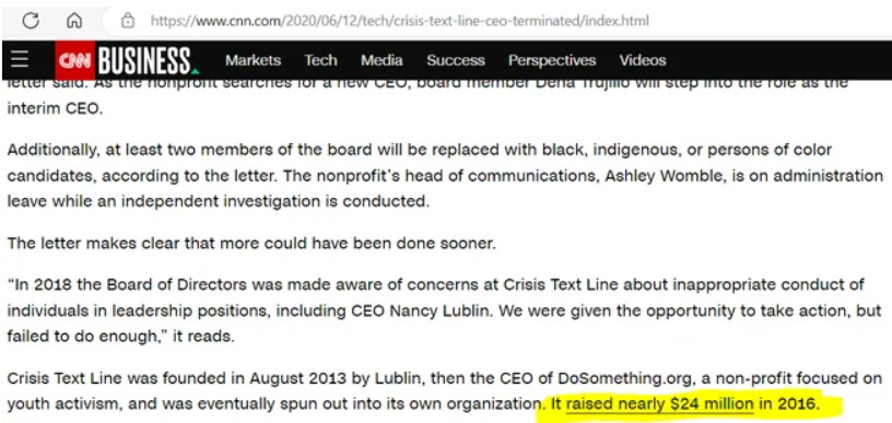 According to a CNN article, in 2016, the Covid Crisis Hotline generated over $24 MILLION: