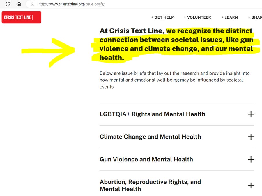 CrisisTextLine.org’s website states that they recognize that issues like gun violence and climate change are connected to mental help.