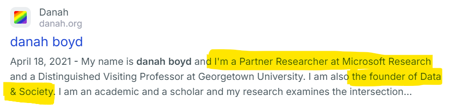 Although Dena is the principal officer of the Crisis Text Line, the president of the company is Danah Boyd… who is also a partner at Microsoft Research and the founder of Data & Society.