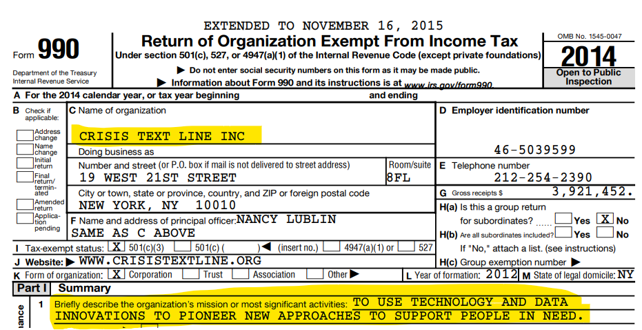 The Crisis Text Line 2014 Financial statement shows the purpose of the company is to “use technology and data innovations to pioneer new approaches to support people in need”:
