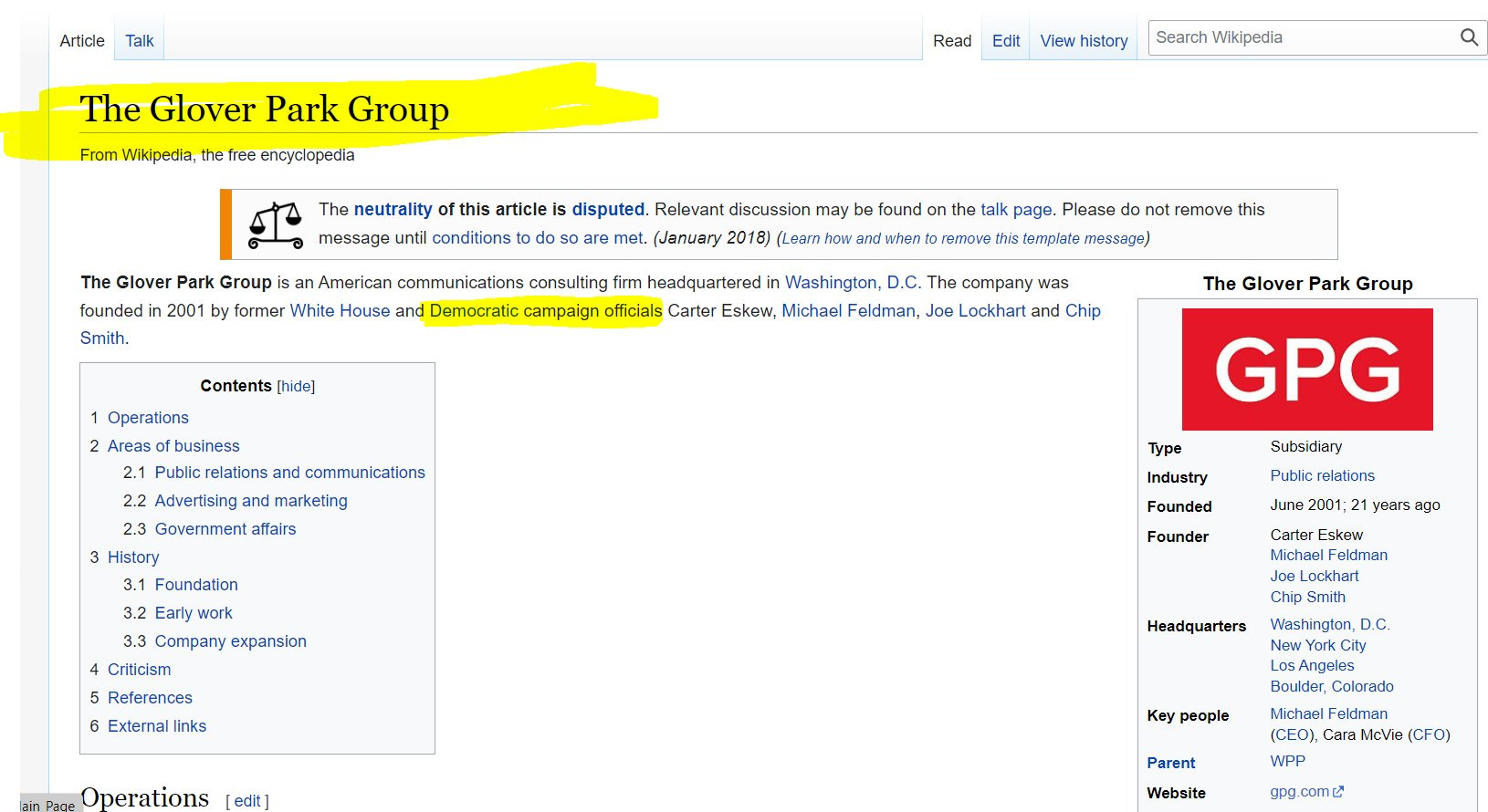 The Glover Park Group was founded by Clinton White House democrats. Their clients included Pfizer, Visa, the Alliance for Climate Protection, Microsoft, Whole Foods Market, the Saudi Government, Hilary Clinton, Verizon Wireless, they were even hired to promote of Michael Moore's documentary Fahrenheit 9/11. (in 2021, Glover became FGS Global)