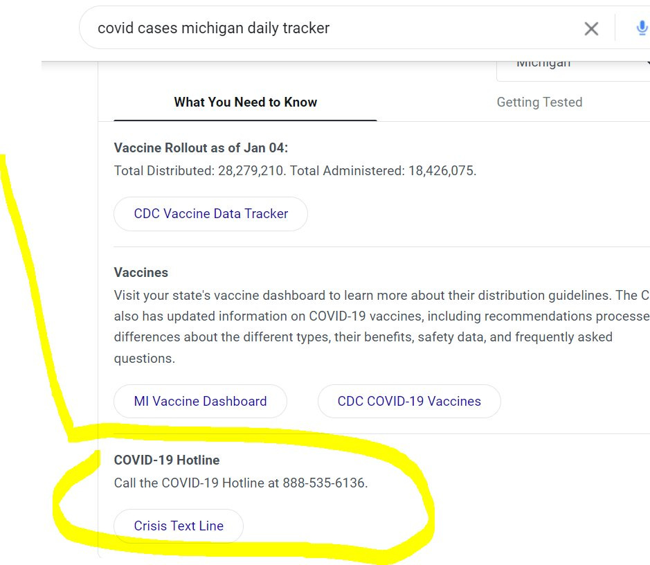 On the Daily Covid Tracker, embedded into the Edge web browser, there was a Covid-19 Hotline featuring a Crisis Text Line phone number: