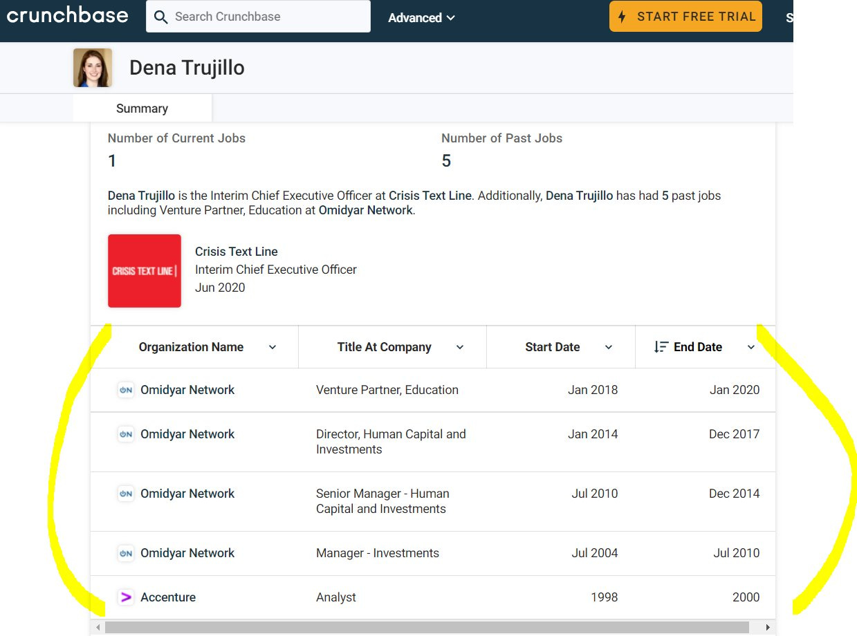 At the time the business was formed, the principal officer was Nancy Lubin, but in 2019, right before Covid, the new principal officer became Dena Trujillo. Who is Trujillo? A woman whose entire career history was spent working for Omidyar Network as the Director of Human Capital and Investments.
