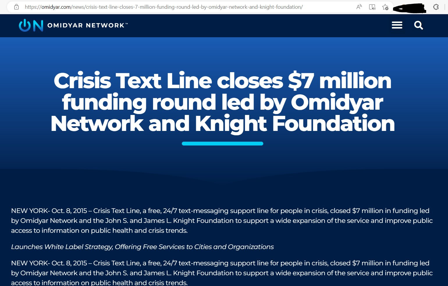 Other than Digital ID, guess what else Omidyar, the investment firm, funds? None other than the Crisis Text Line: