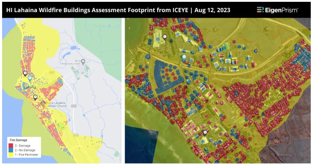 Take a look at this map from the fire. Red is DAMAGED. Blue is NO DAMAGE. The NO DAMAGE are in clusters. The more you look at the evidence, the more it doesn't fit with a military DEW attack, in my anonymous-Substack-author-with-a-cartoon-avatar opinion: