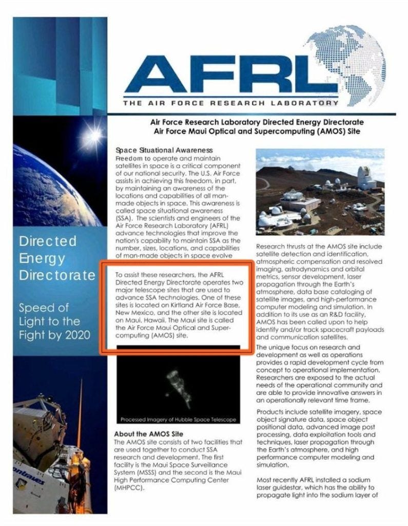 You may have seen the image below, it is an old document I located and shared on Twitter, as further evidence supporting the DEW theory. The document is authored by The Air Force Research Laboratory, it is a “Directed Energy Directorate” from the Air Force in MAUI. My discovery, with my orange square on it, ended up all over the internet, as further proof of DEWS being used in Maui: