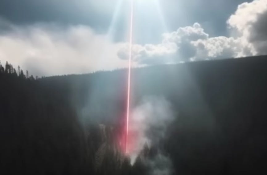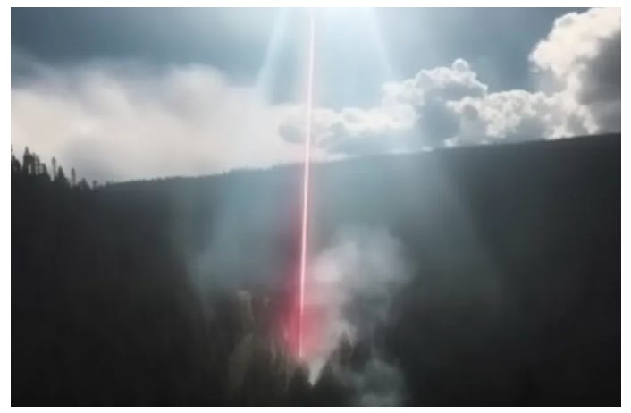 The laser beam is directly in the center of the photo, completely unobstructed because there’s no trees exactly where that beam is. There's smoke coming up around the firey-colored beam to emphasize how hot it is. The trees are hazy / blurry, the background is hazy, but that damn laser is clear … it’s too perfect. It reminds me of when a murderer tries to throw the police off his tracks by planting evidence to steer the investigation away from himself. Folks, the more I think about it, the less I think DEWs make sense.