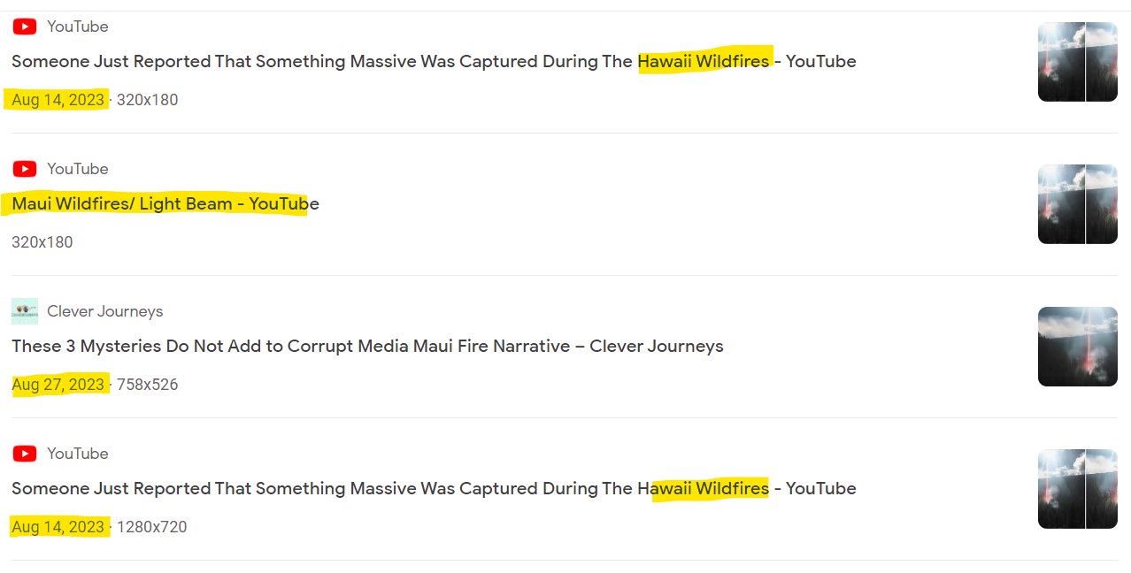 I tried to figure out who was the very first to post these photos online using the keywords “Maui” or “Hawaii” + “DEW” or “Wildfire”. I was not able to trace this back to the first (bogus) poster, but it sure would be interesting to find that out. I can’t help but wonder if they all came from one or two PSYOP Twitter accouts.