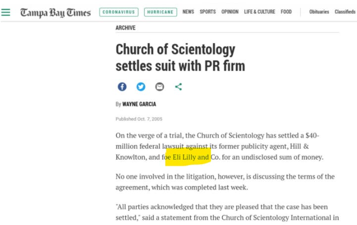In 1994, it would come to light that Prozac manufacturer, Eli Lilly made a generous donation to the church (Read my article MKUltra & Eli Lilly: Mind and Population Control at the Same Time)