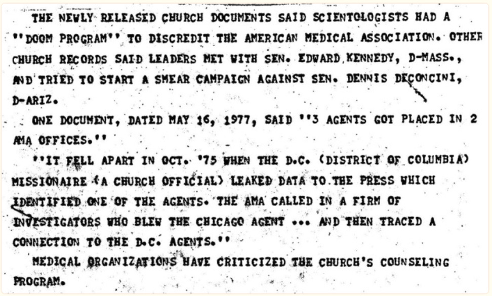 The same year as the Churches attacks, a judge working for the US government agreed to allow the release of selectively chosen Scientology documents which were part of the 1977 FBI raid. The government then released documents showing that Scientology had also successfully infiltrated the American Medical Association (AMA) by planting spies within the organization. This espionage was part of their “Doom Program” subprogram called “Operation AMA Doom”, in which Scientologist agents photocopied and stole documents and files.