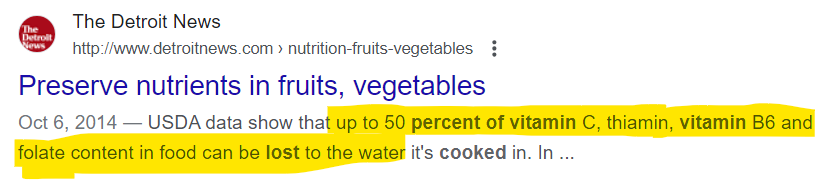 This means, 0% - 50% of the nutrients (allegedly) leave the plant and go into the water (which is what will be used to make the Vitamin), while the remaining 50%- 100% of the nutrients stay in the boiled plant. I guess we can think of this like making tea, at very high heat, very quickly. So, right out the gate, the plant-vitamin-water contains a fraction of the nutrition as the plant does.