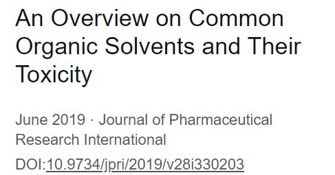 In the ResearchGate article, we learn that “Organic solvents are known as carbon-based solvents”; ah, ok, so it’s just like coal tar and plastic being natural Vitamin ingredients because they contain carbon. F*cking carbon. Anyway, the article goes on to say, “Almost all of the solvents are hazardous to health, if swallowed or inhaled”. Here’s a list of the most common organic solvents: